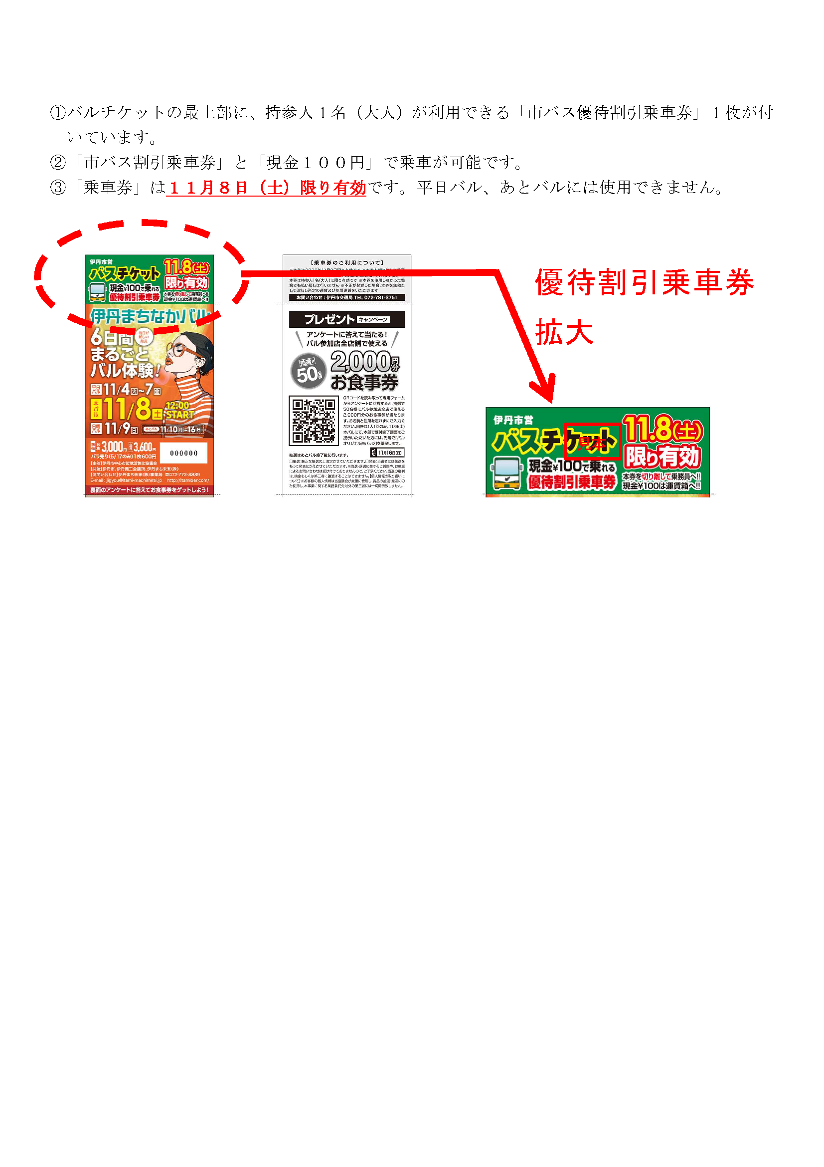 伊丹市交通局は、飲酒運転ゼロで気軽にお酒を楽しんでもらうため、バルチケット(6枚つづり)に大人1人100円で市営バスの乗車ができる「伊丹市営バス優待割引乗車券」1枚を付け、「伊丹まちなかバル」を応援します。