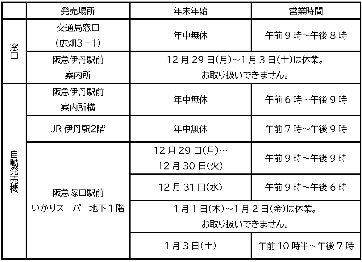 いつも市バスをご利用いただき、ありがとうございます。窓口及び自動発売機の年末年始の営業時間は、以下のとおりとなります。